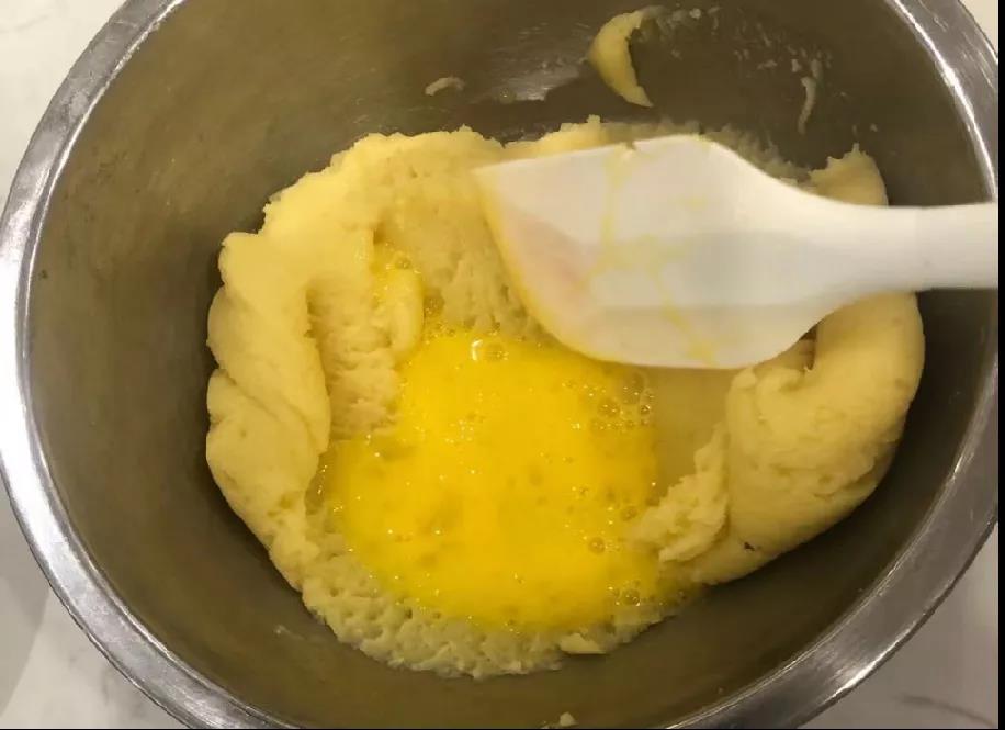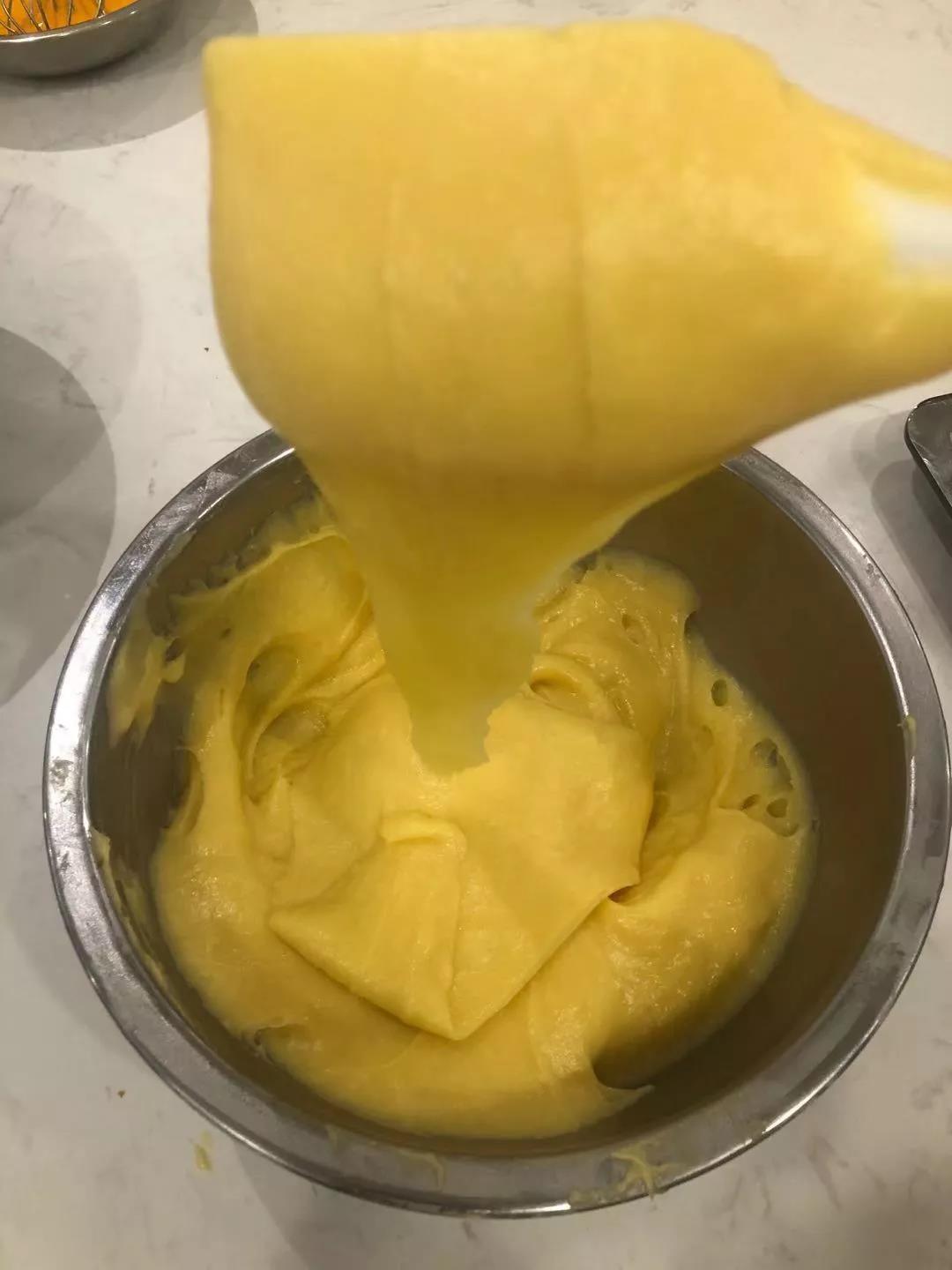 5、加入蛋液至提起刮刀,面團(tuán)會(huì)掉落,并形成一個(gè)倒三角