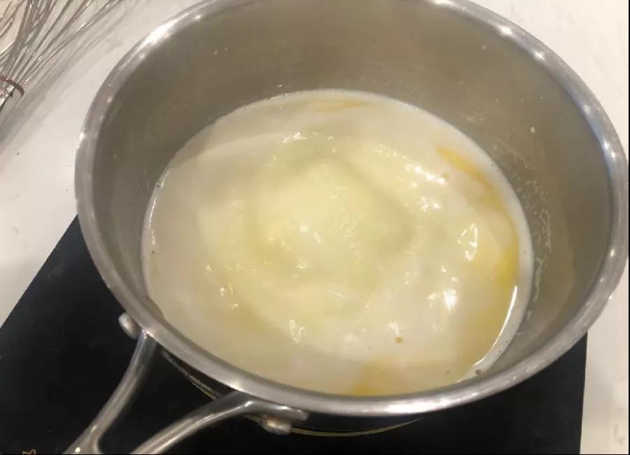 1、水,牛奶,黃油放在鍋中,加熱煮沸。