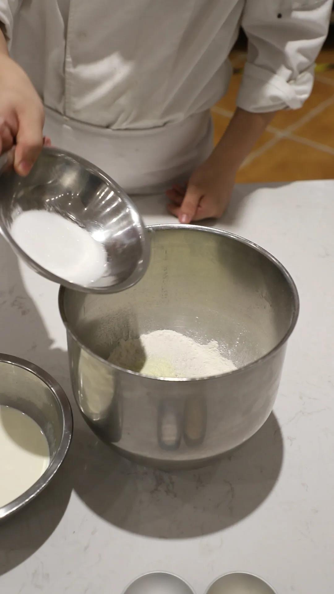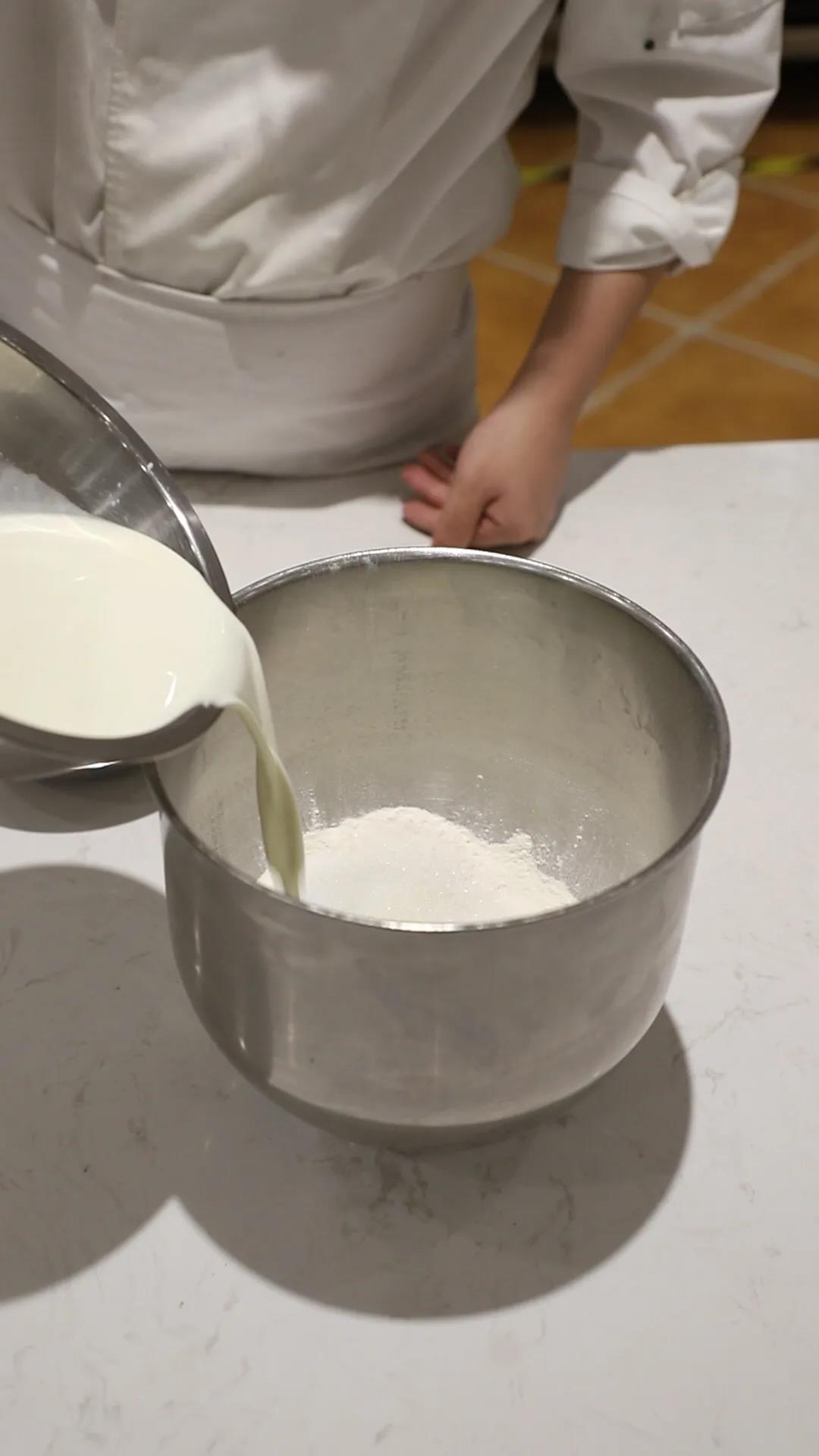 1.攪拌:先將濕性材料、面粉、酵母、鹽、老面一起先慢速打均勻,然后快速打至5~6成,將提前切好軟化的酥油放入一直打至光滑有韌性6~7成(不是太軟,面團溫度 26度);