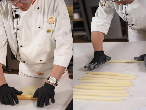 1.面團(tuán)等份分割,搟平卷起,搓成長(zhǎng)條。