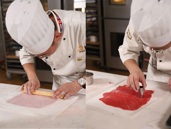 4.蓋上醒發(fā)定型并刷上蛋液的面團(tuán)上。