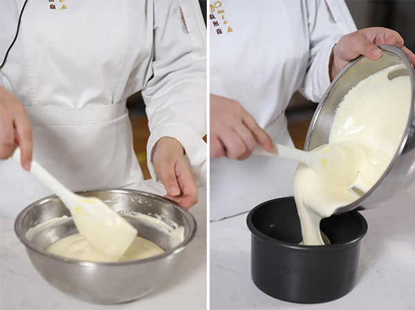 4.蛋黃糊+蛋白霜翻拌勻,注入戚風(fēng)模具烘烤 溫度 160/150 40min;