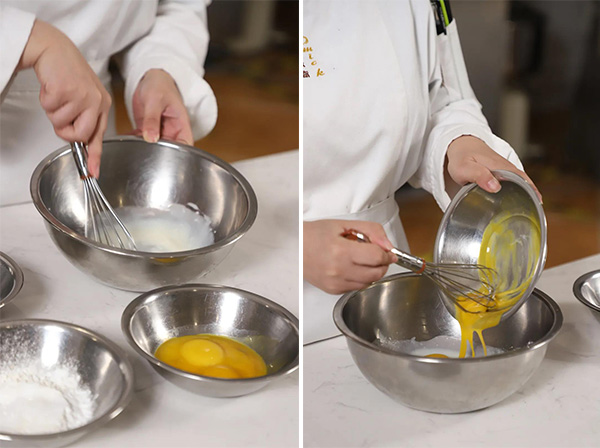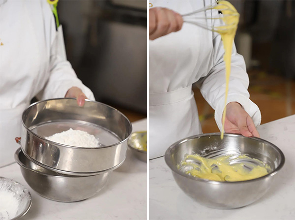 2.1+過(guò)篩的低粉,淀粉,泡打粉,拌勻,加入蛋黃拌勻備用;