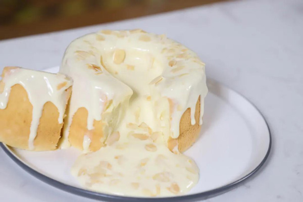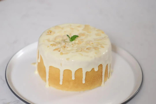 9.繼續(xù)在表面擠上奶蓋醬,并在邊緣處慢慢擠上,使奶蓋沿著邊緣流下,呈現(xiàn)淋面狀。鋪上烤好的杏仁片即可。