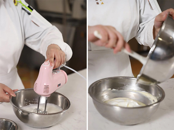 3.蛋清加糖加塔塔粉打發(fā)至彎鉤狀;